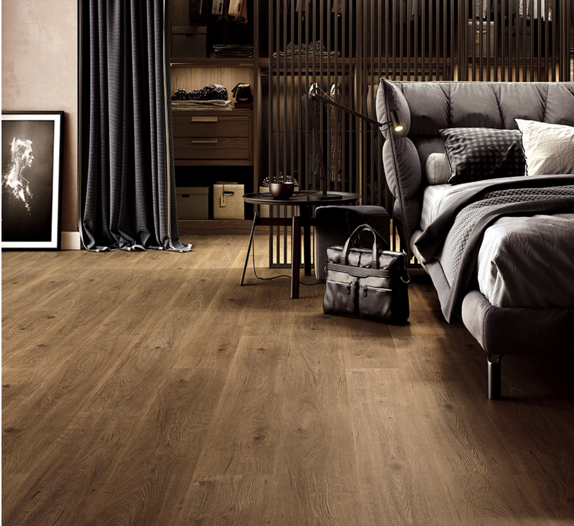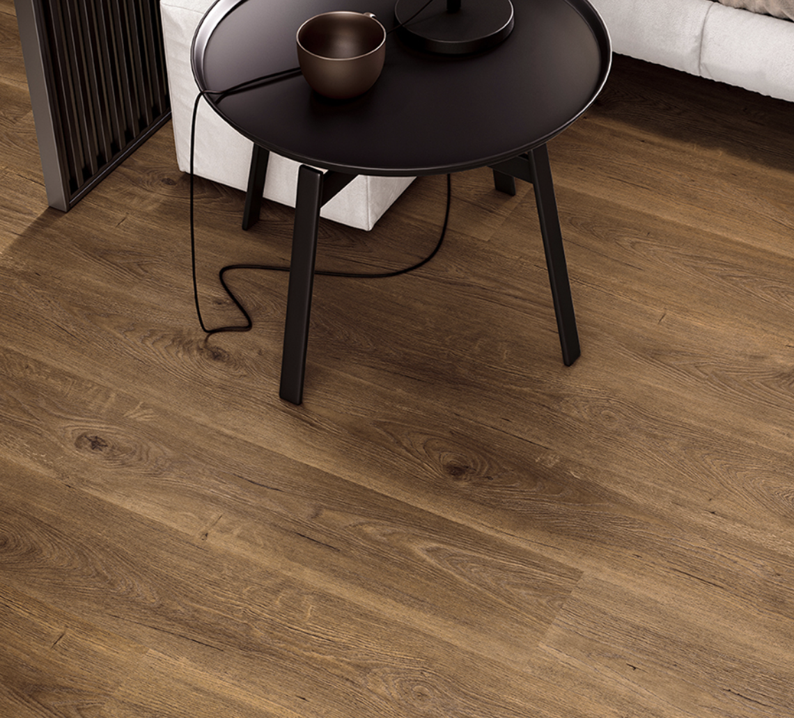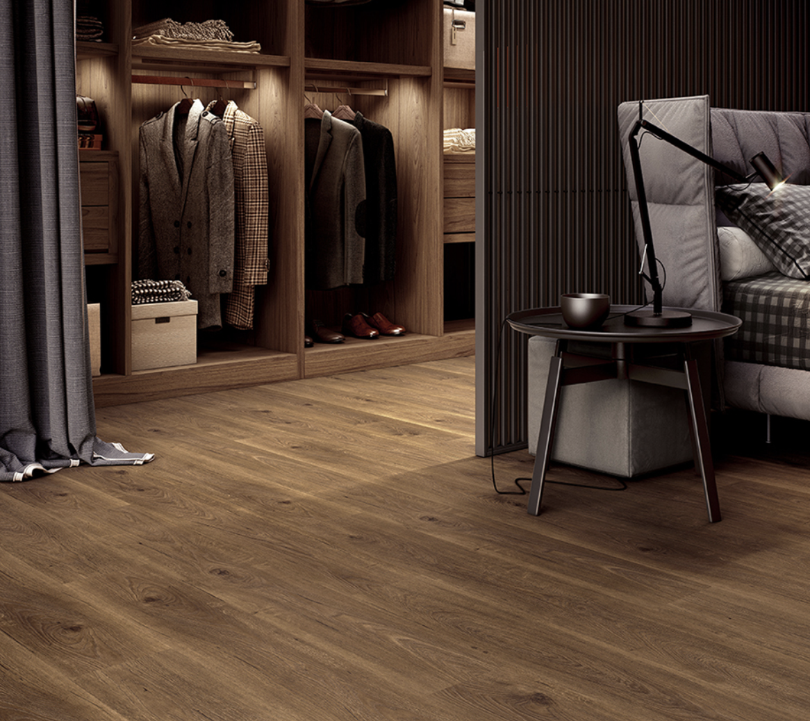 Sprekker, kvister, speilbilder… Treets ufullkommenheter feires og gjenskapes i dette designet som synkroniserer gulvets tekstur med mønsteret i Eik Wexford Tostado. Den naturlige fargen av værbitt tre øker realismen i resultatet.