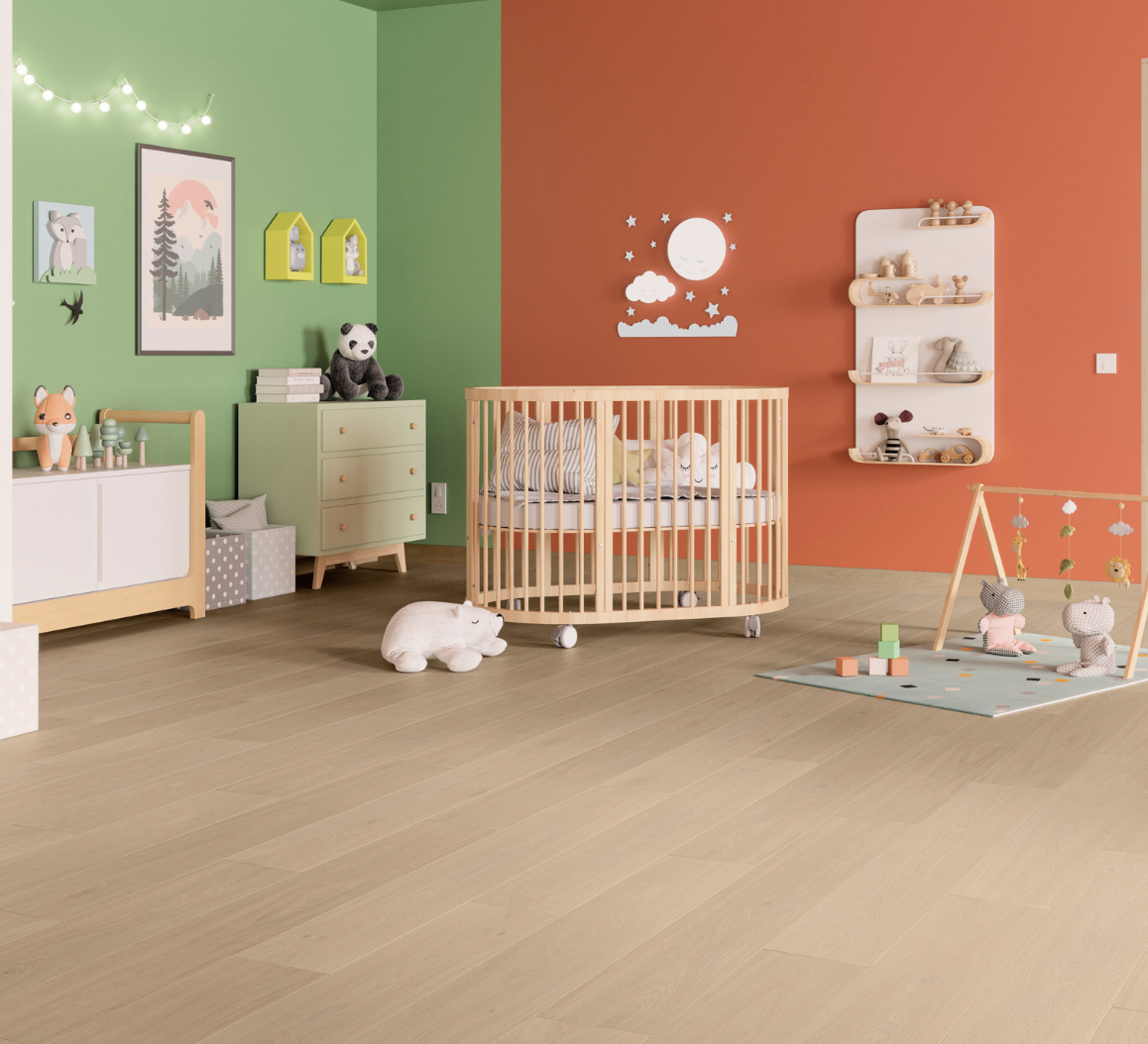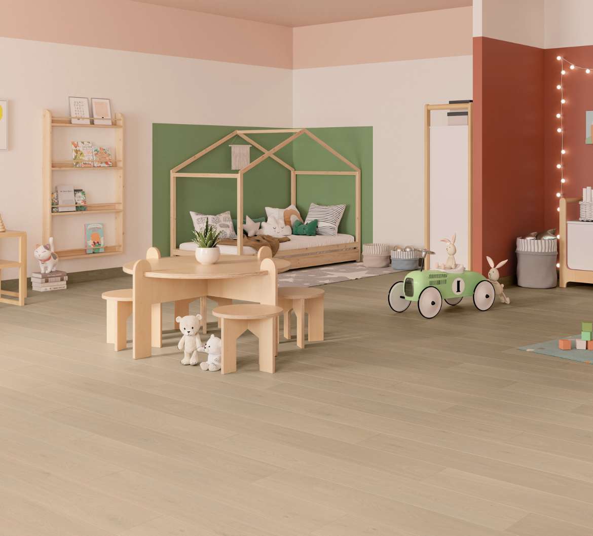 Roble Magari har en myk rå eiketone og viser variasjoner i fargeintensitet mellom plankene, slik som ekte heltregulv. Det utmerkede ekstra-matte Tibet-utførelsen passer perfekt inn i omgivelsene, tilfører dybde og forsterker det realistiske utseendet.